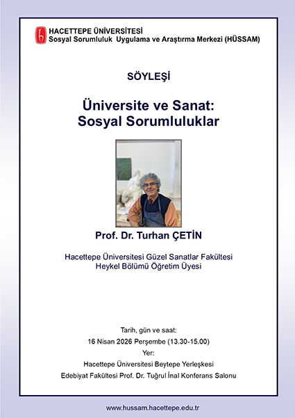 Hacettepe Üniversitesi Sosyal Sorumluluk Uygulama ve Araştırma Merkezi (HÜSSAM) tarafından 16 Nisan 2026 Perşembe günü düzenlenecek olan ve Prof. Dr. Turhan ÇETİN'in konuk olarak katılacağı "Üniversite ve Sanat: Sosyal Sorumluluklar" konulu Söyleşi etkinliğine bütün Hacettepeliler davetlidir.
